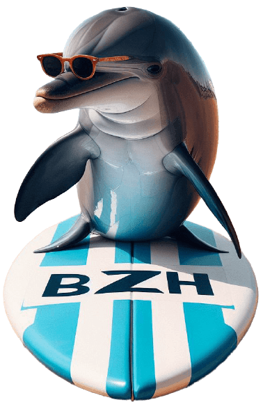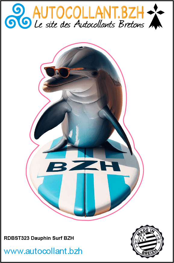 Bringen Sie einen Hauch von Bretagne in Ihre Einrichtung mit diesem originellen Aufkleber, der einen Delphin darstellt, der auf einem Brett mit der Aufschrift „BZH“ surft.