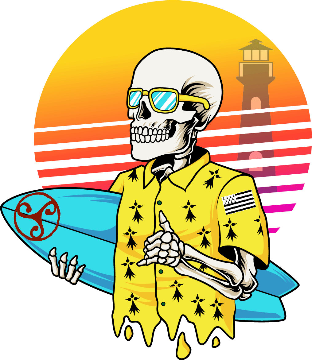 Fabriqué en Bretagne avec des matériaux de haute qualité et résistants aux intempéries, cet autocollant est parfait pour une application sur votre voiture, moto, planche de surf, ordinateur portable ou tout autre support lisse. Son design décalé met en scène un squelette surfeur arborant une chemise aux couleurs de la Bretagne, des hermines et le drapeau breton. La planche de surf qu'il tient fièrement arbore un triskell, symbole celtique emblématique, tandis que sa main levée effectue le célèbre shaka, salut incontournable des surfeurs.