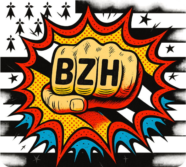 Affirme ton identité bretonne avec cet autocollant percutant 💥 : un poing stylisé façon BD qui clame haut et fort : BZH ! En arrière-plan, le drapeau breton (Gwenn ha Du) et les hermines renforcent encore le message : ici, c’est la Bretagne qui parle fort 💪⚫⚪