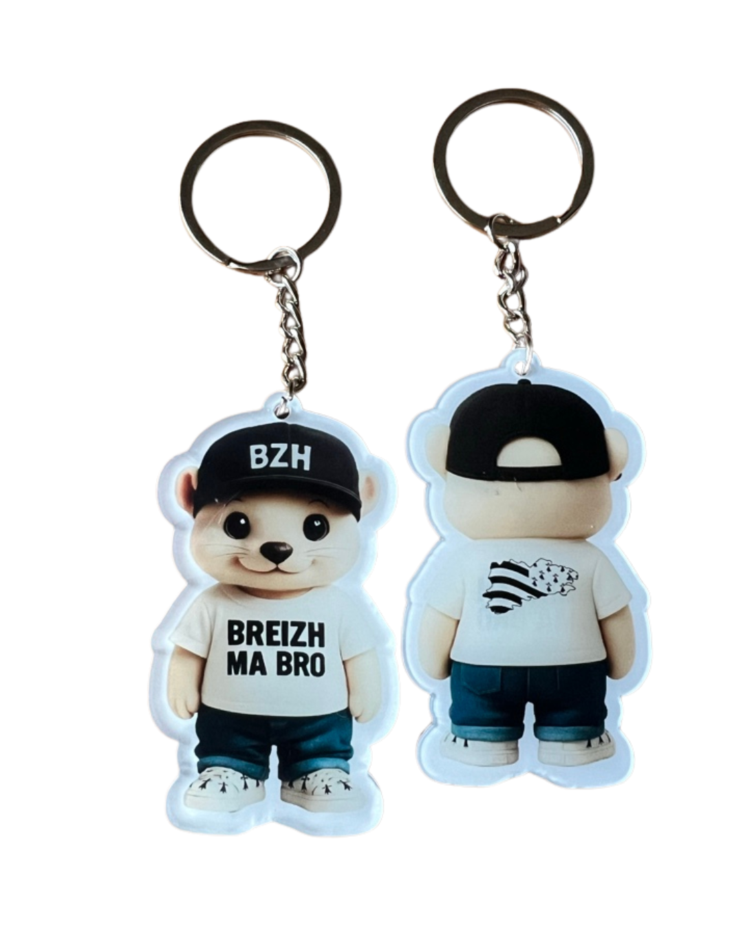 Affiche ton amour de la Bretagne avec notre adorable hermine streetwear : casquette BZH devant, tee-shirt BREIZH MA BRO au recto et petite carte de Bretagne stylisée au verso. Compact, solide… et prêt à faire sourire ton trousseau.