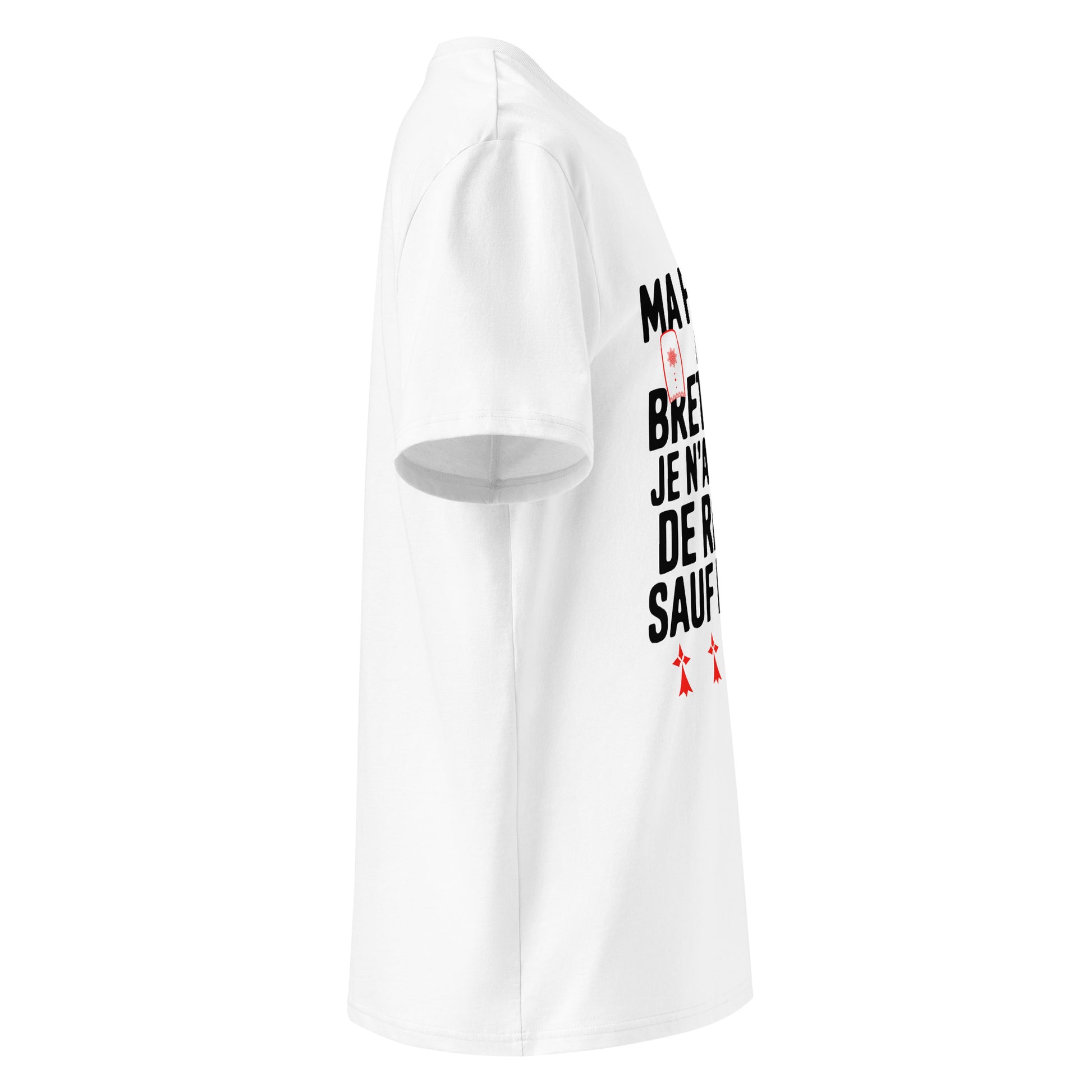 Le message, accompagné de petits motifs bretons rouges, rend ce t-shirt unique et idéal pour faire sourire. Avec son tissu en jersey simple de 180 g/m² (5,3 oz/yd²) et sa coupe moyenne, il est aussi agréable à porter qu’à regarder. Que vous soyez Breton, marié à une Bretonne ou simplement fan d’humour régional, ce t-shirt est fait pour vous !