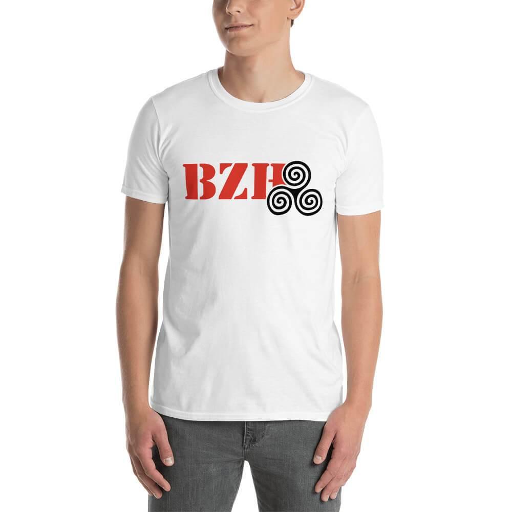 BZH (Breizh) t-shirt in red accompanied by a Black Triskell