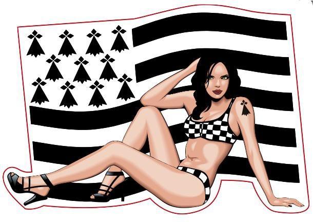 Un autocollant Breton Vintage avec sa belle Pinup Brune posant devant le Drapeau Breton.