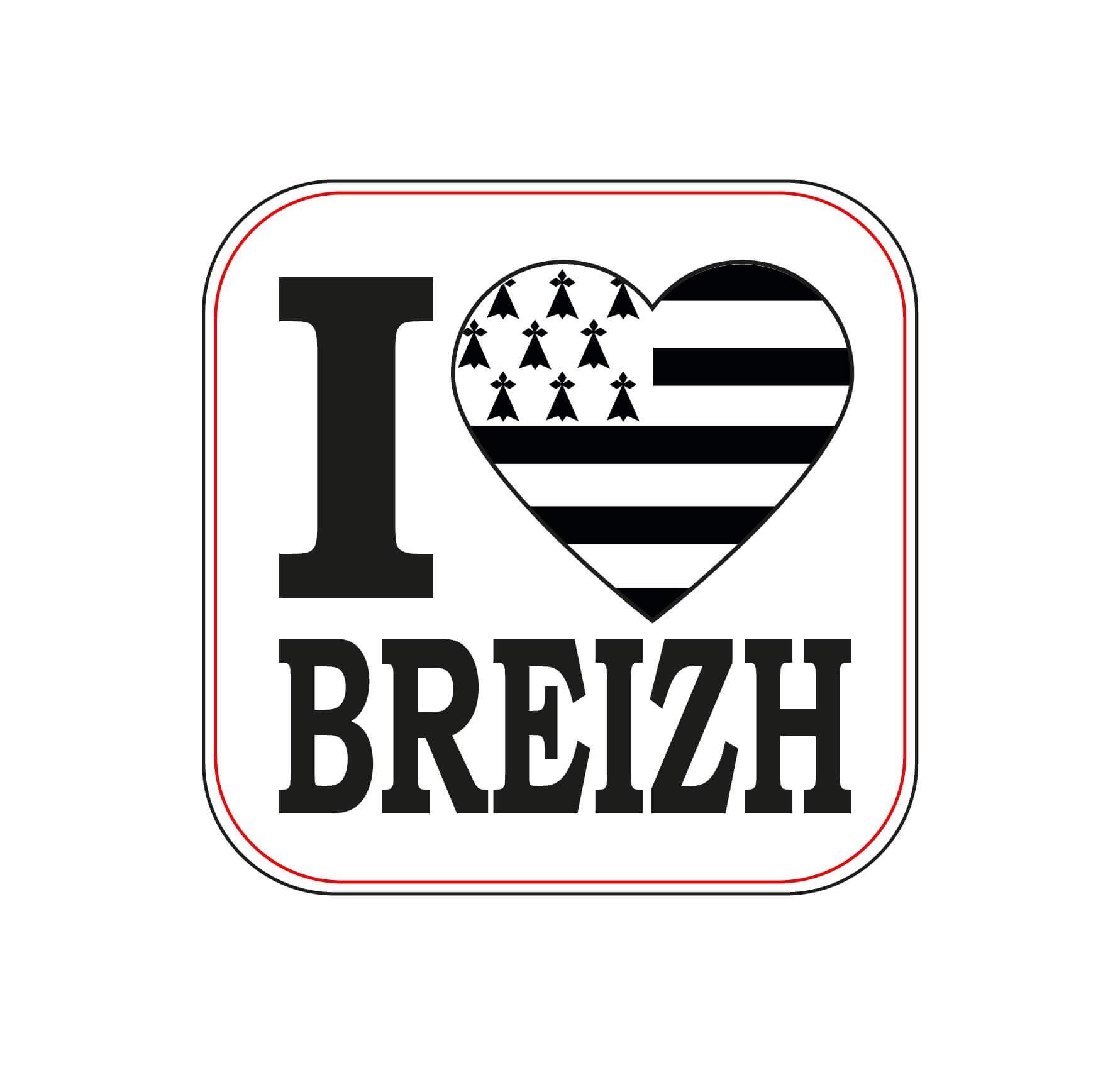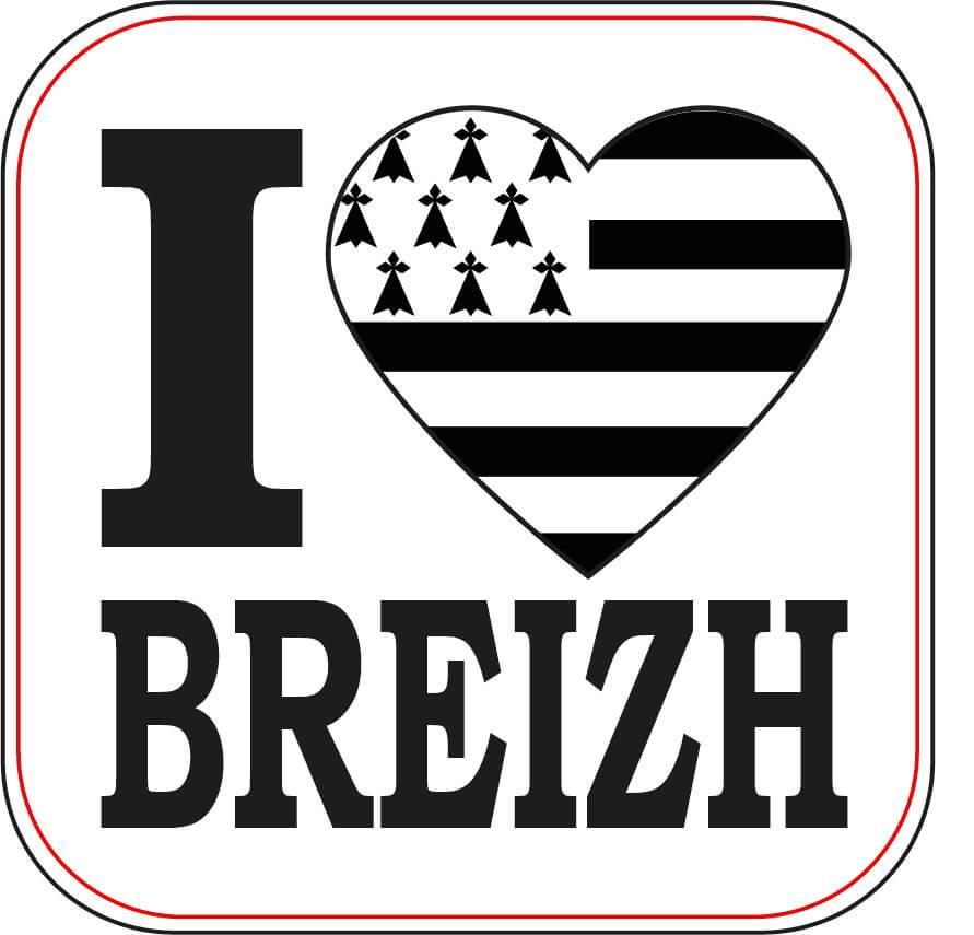 Autocollant Breton avec le symbole I LOVE Breizh accompagné d'un cœur Drapeau Breton.