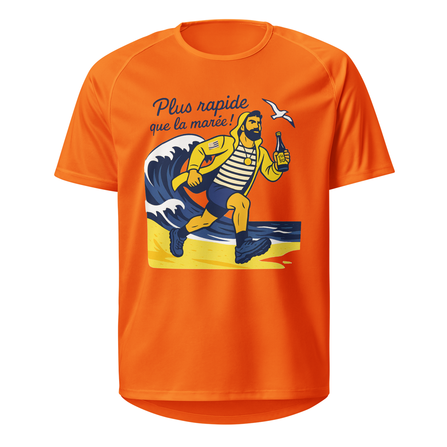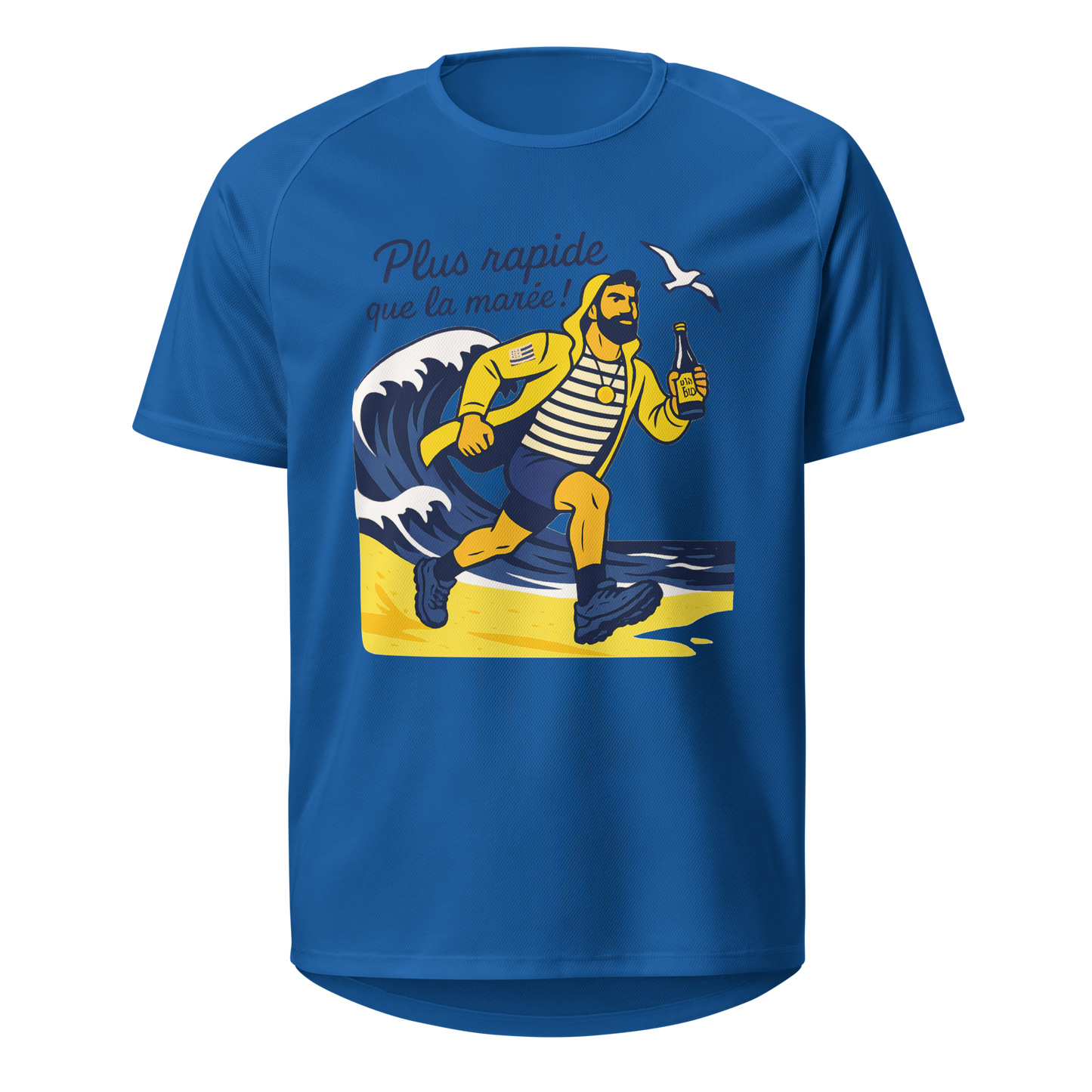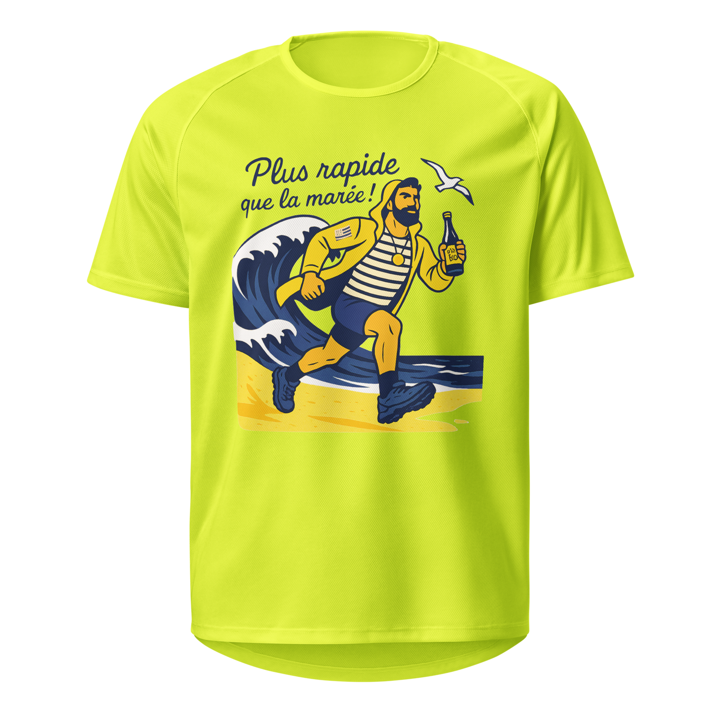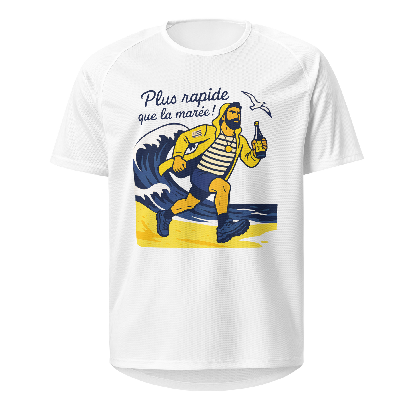 Enfilez votre nouveau t-shirt “Plus rapide que la marée !” et carburez à l’esprit breton : un visuel haut en couleur mettant en scène notre athlète emblématique, ciré jaune au vent et marinière stretch, défiant une vague déferlante. Parfait pour montrer que vous foncez plus vite que la marée… ou du moins pour le croire !