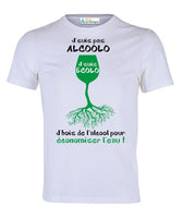 Tee-shirt blanc manches courtes avec visuel, J'suis pas Alcoolo J'suis Écolo, je bois de l'alcool pour économiser l'eau