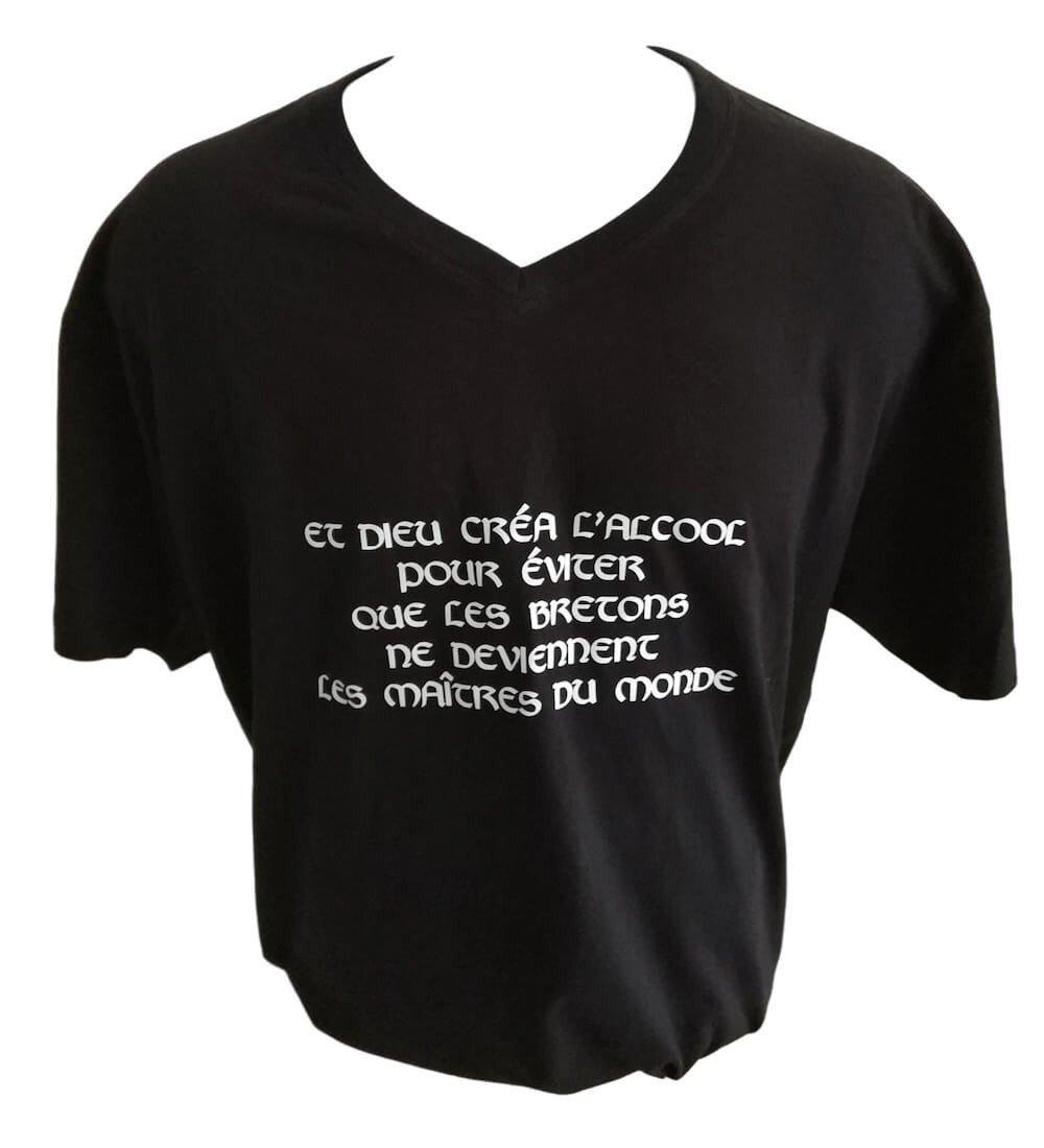Ce tee-shirt breton humoristique est un excellent moyen d'afficher votre fierté bretonne et votre sens de l'humour. Avec son texte "Et Dieu Créa l'Alcool pour éviter que les Bretons ne deviennent les Maîtres du Monde", ce tee-shirt est sûr de faire rire vos amis et votre famille.